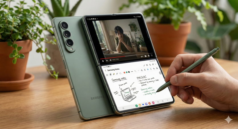 자연 친화적인 '그린' 색상은 트렌디하면서도 편안한 느낌을 줍니다. 플렉스 모드에서 S펜을 사용하여 필기하는 모습은 갤럭시 Z 폴드만의 생산적인 활용성을 강조하며, 차분한 그린 컬러와 잘 어울립니다.